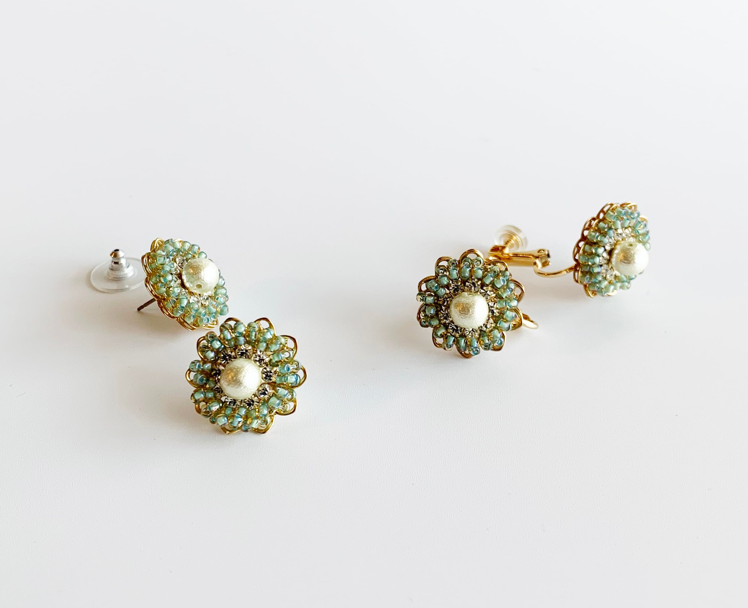 ブルーグリーンのさわやかで柔らかいカラーのピアスとイヤリング。